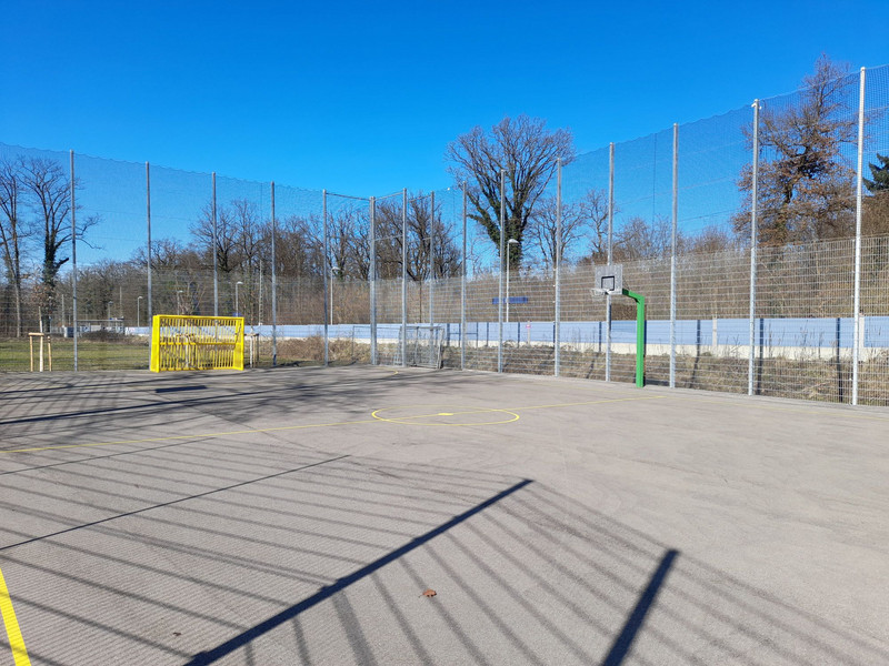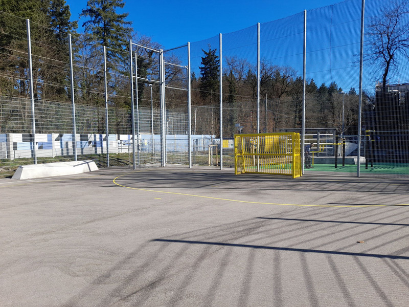 Der Bolzplatz hat eine geteerte Fläche, ist umzäunt und hat zwei Minitore.