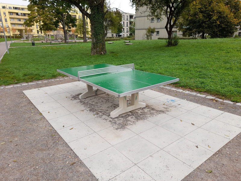Die Tischtennisplatte steht in mitten der Grünanlage zur freien Verfügung.